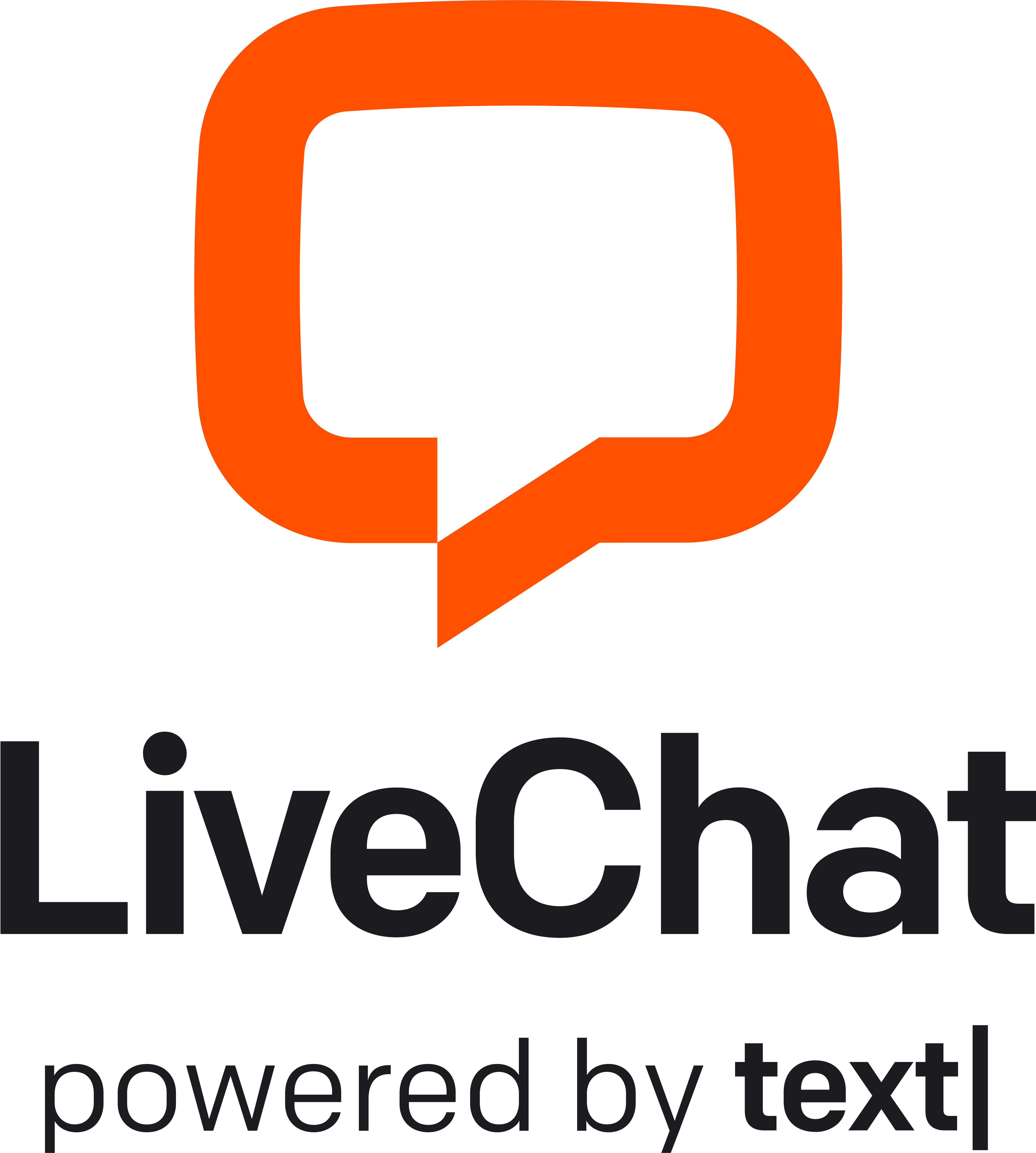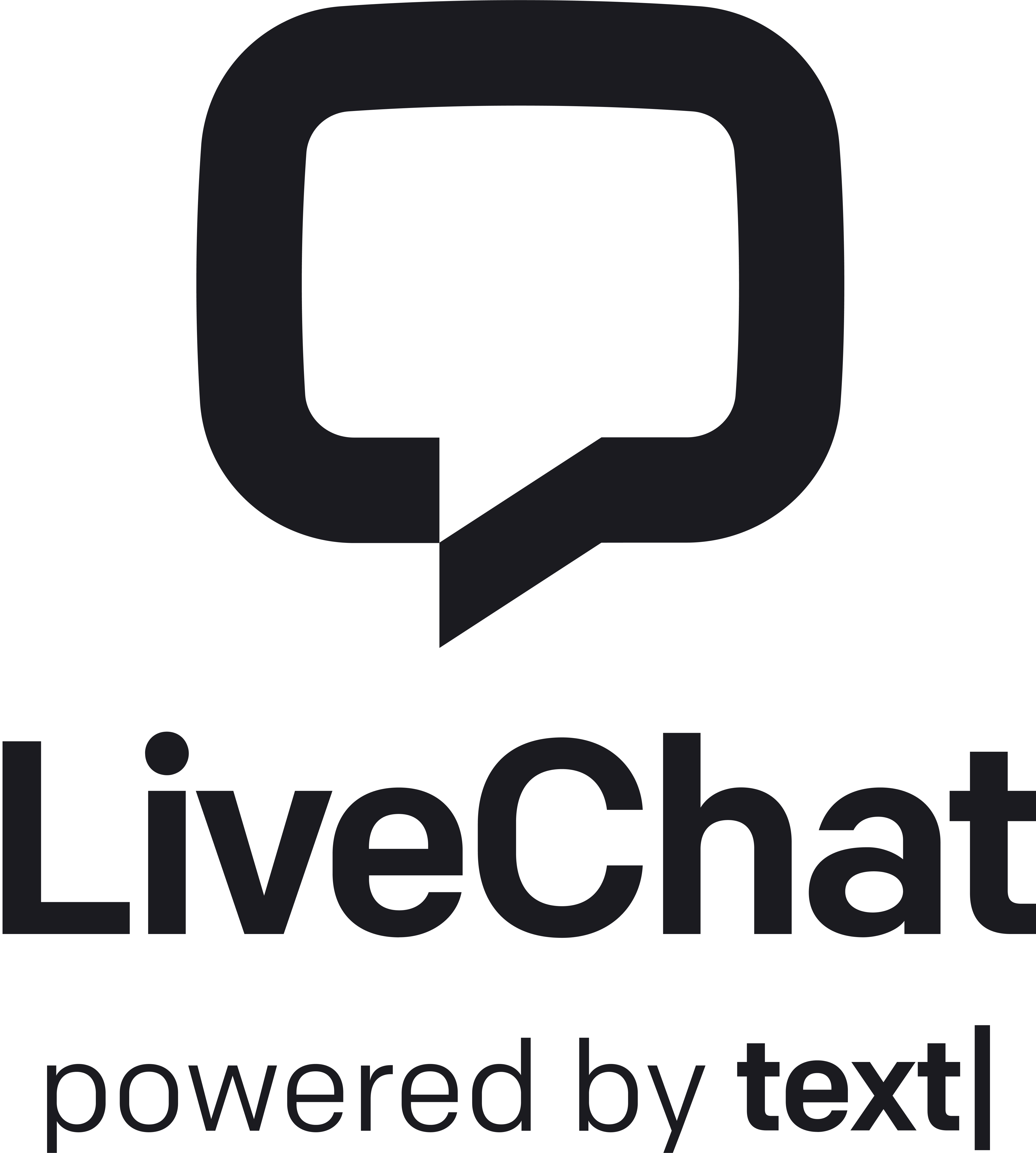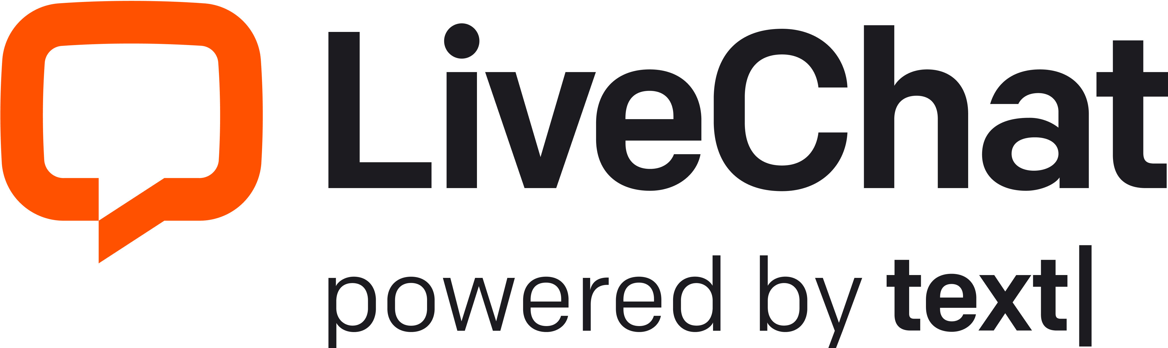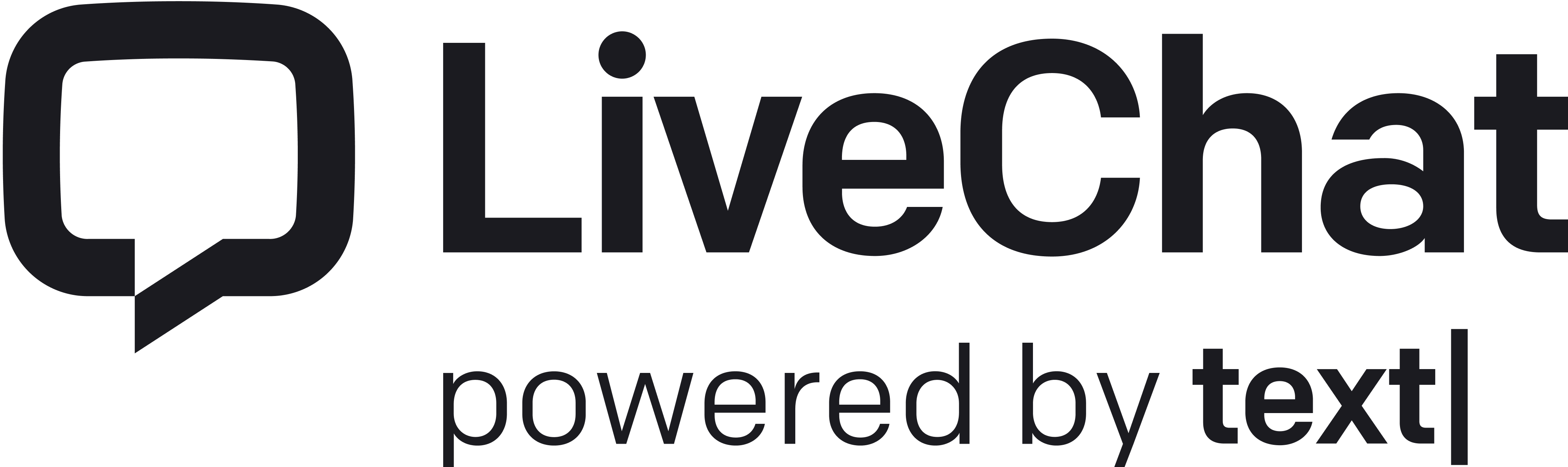 The LiveChat logo is composed of a chat bubble symbol and a logotype set in Colfax Medium. The horizontal logo is the primary logo and should be used in most instances. The stacked logo is for large-scale use.
